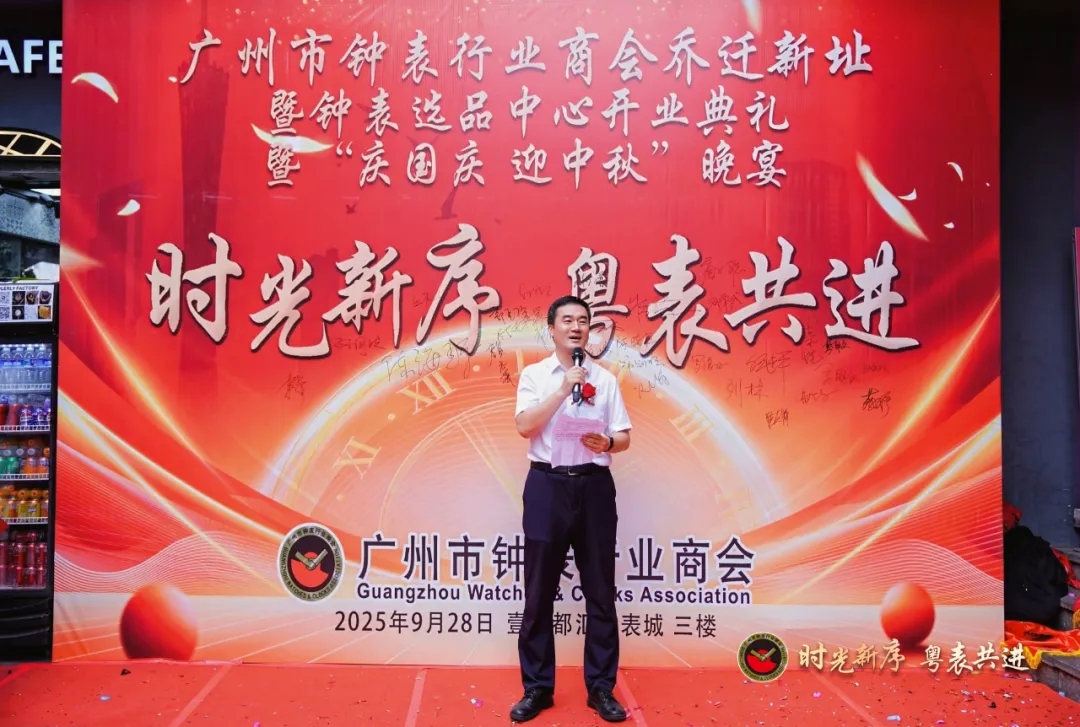 秋光溢彩,盛典如约。2025年9月28日,位于壹号都汇钟表城三楼的广州市钟表行业商会新址嘉宾云集,高朋满座。商会六届九次理事会、乔迁新址揭牌仪式、钟表选品中心开业盛典及“庆国庆·迎中秋”答谢晚宴在此隆重举行。整场活动以“时光新序,粤表共进”为主题,议程紧凑,亮点纷呈,共同谱写了广州钟表行业发展的崭新篇章。