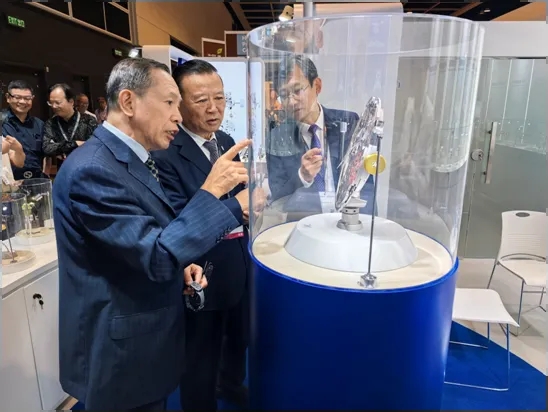 中国钟表协会张宏光理事长、副理事长任建平驻足欣赏JH7158自鸣、大日历机心大模型