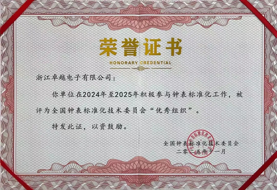 浙江卓越电子有限公司被评为全国钟表标准化技术委员会【优秀组织】