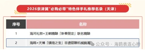 近日,天津海鸥表业集团有限公司与天津博物馆合作开发的“海鸥与天博联名非遗银雕机械腕表”,成功入选2026京津冀“必购必带”特色伴手礼推荐名录,成为京津冀消费季中展现天津文化与工业实力的标志性产品。