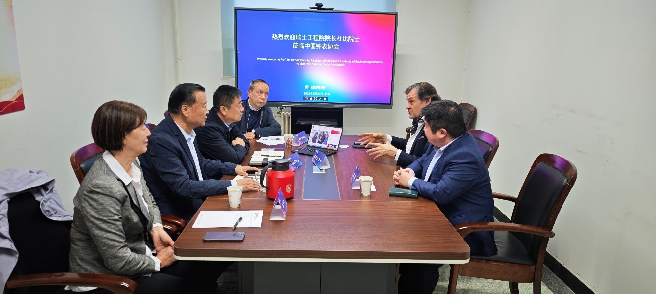 2026年3月29日,瑞士工程院院长、中国工程院外籍院士、日内瓦大学医学院院长贝努瓦·杜比先生一行访问了中国钟表协会。吕程理事长、张宏光原理事长、任建平副理事长和李夏顾问与杜比先生进行了会谈,就双方合作进行了积极探讨。上海大学中瑞先进技术研究院执行院长张磊教授陪同访问。