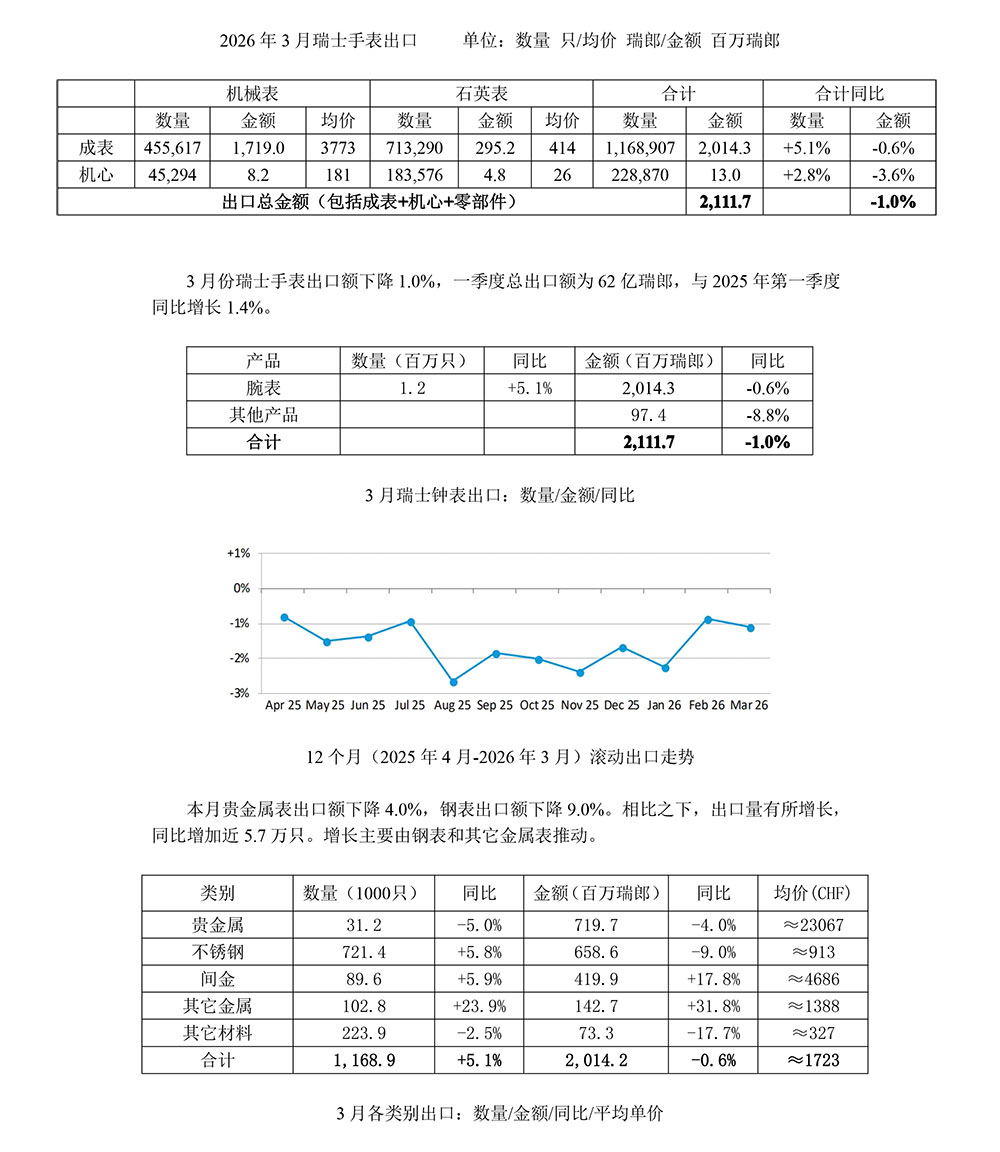 2026年3月瑞士手表月出口统计与分析