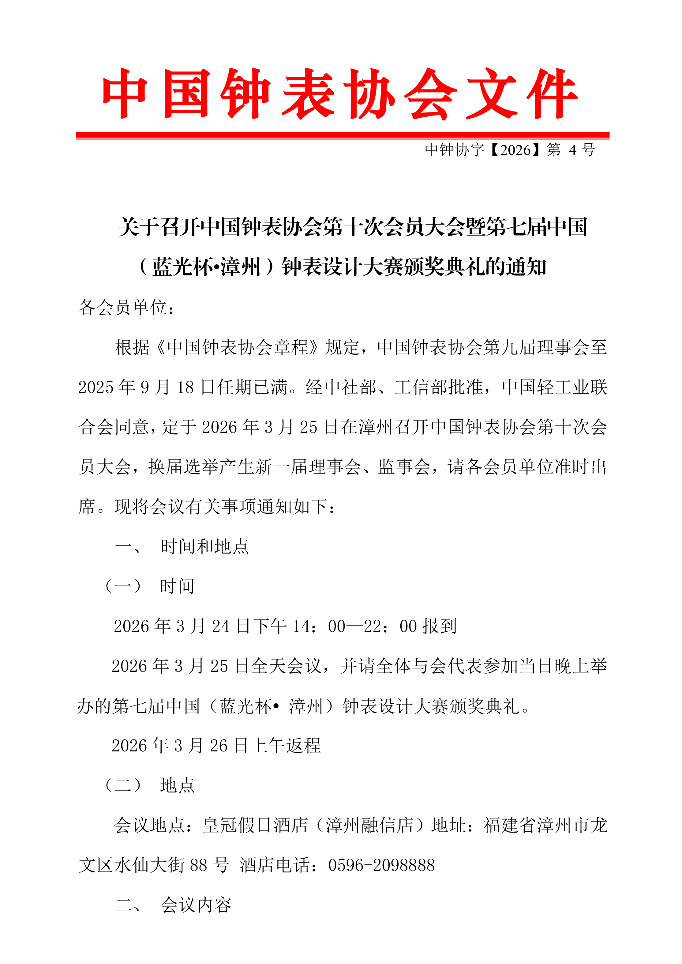 关于召开中国钟表协会第十次会员大会暨第七届中国蓝光杯-漳州钟表设计大赛颁奖典礼的通知