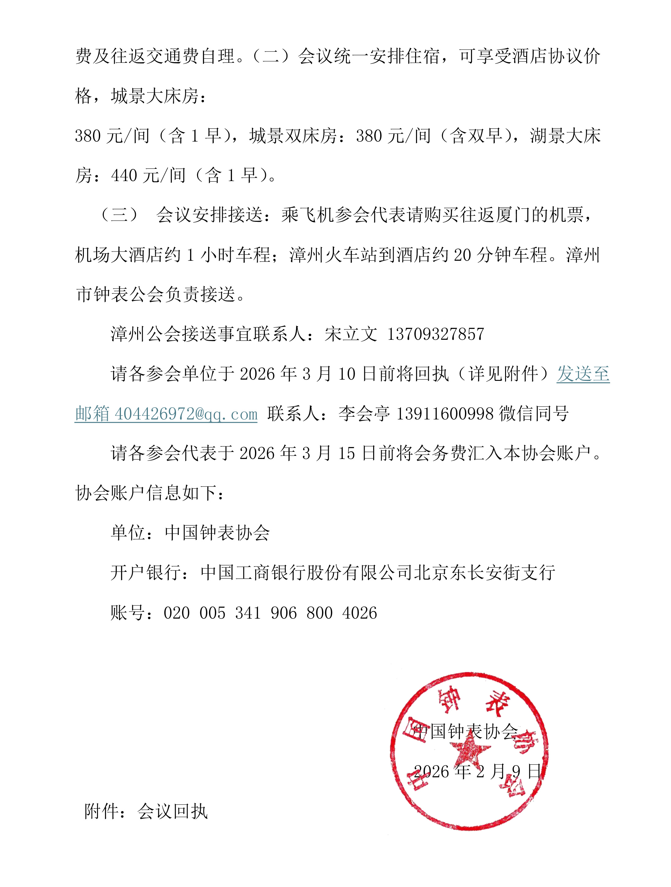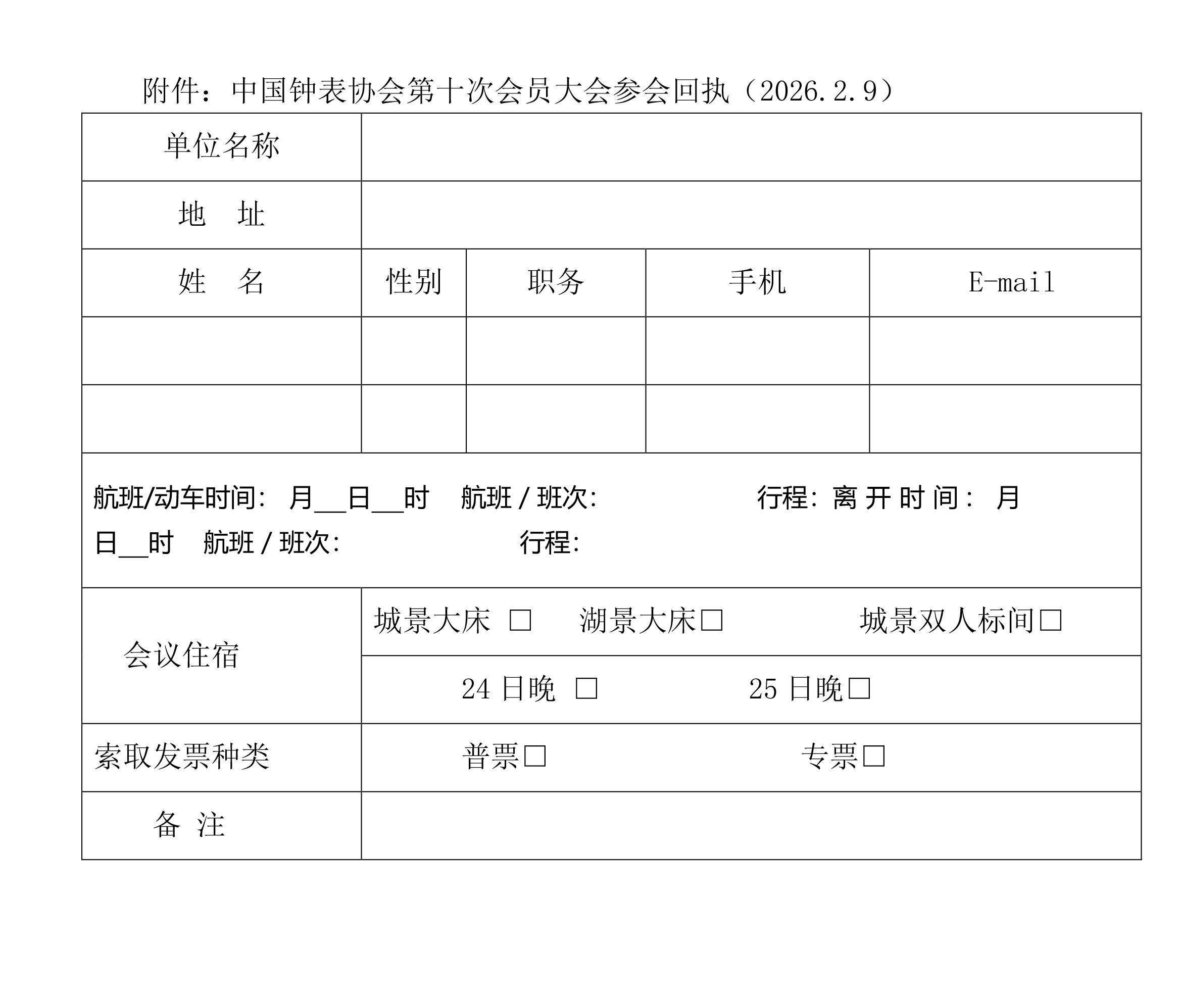 中国钟表协会第十次会员大会参会回执