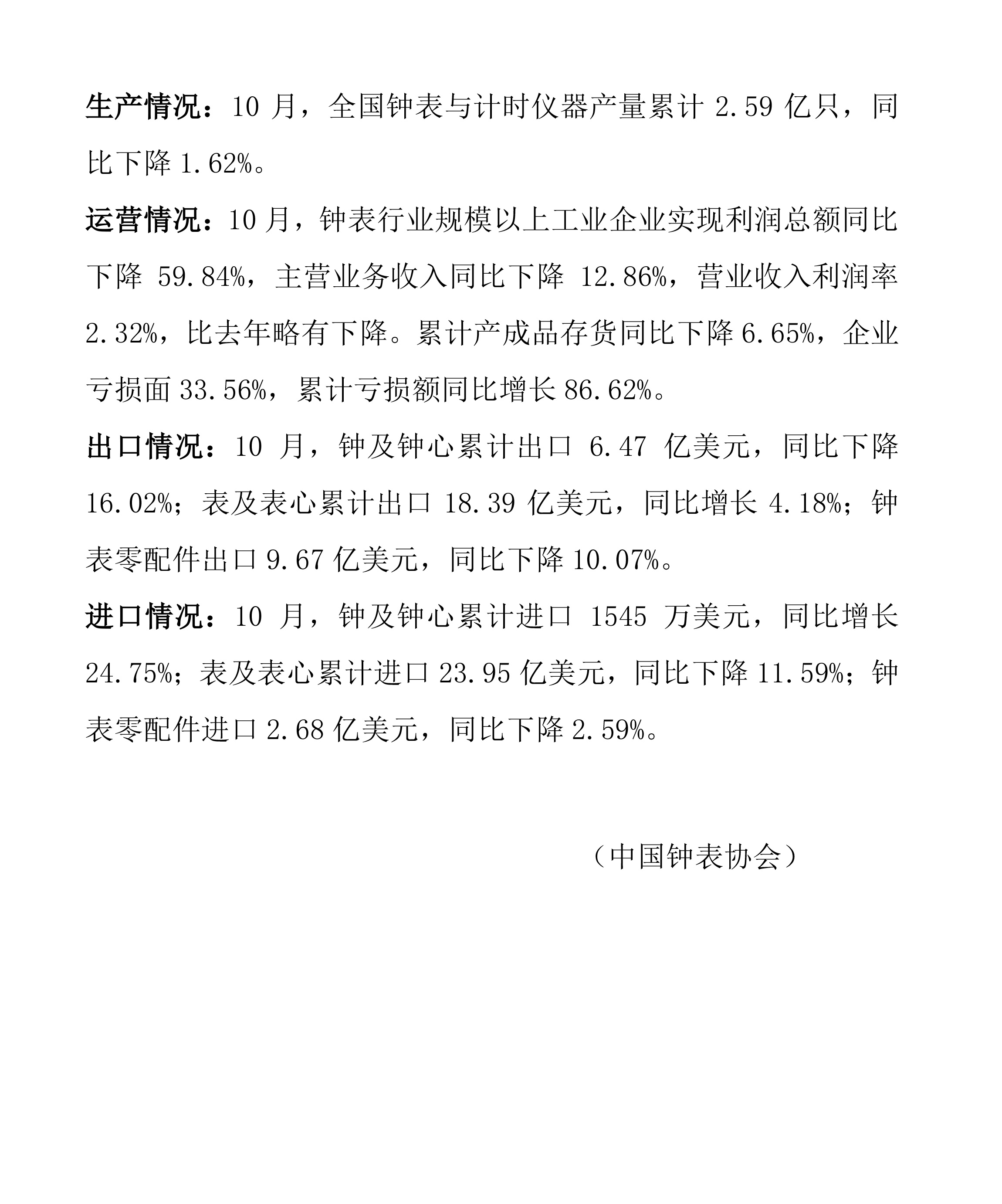 2025年10月钟表行业经济运行简报