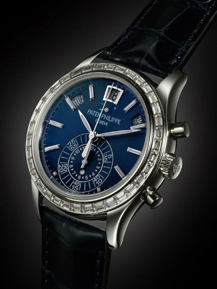 自动上弦机芯,950铂金,表圈、表扣及点字盘共镶58粒(重4.68卡) 梯方钻石,年历,飞返计时码, 日、夜及动力储存指示,豪华型腕表,型号5961P