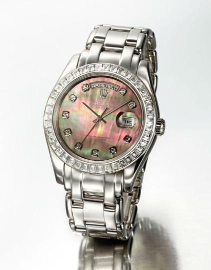 自动上弦机芯,950铂金,高质梯方钻石表圈(重约3卡),大三针,星期、日历,珠贝母表盘,钻石字盘,特别版链带腕表,型号18956 NG