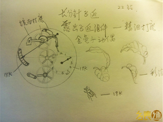 ”那些年,我们一起捉过的金龟子!这个主题其实是我构想已久的,为了实现这个简单的非线性动偶,我不得不利用三枚等齿过轮,将时间显示机构改为长分针逆跳结构,要把逆跳结构露出来,真的需要一丝不苟的制作和打磨,无论是零件的造型设计还是镜面研磨,都在消耗我大量的时间,也许这就足够奢侈了,改自积家P449手动机芯,机芯一度被VC购买后做成名机453。机芯直径28mm,整表直径35mm,厚度11.5mm,从草图和列出的24项制作选项看,制作这样一枚带动偶的腕表的确有一定的难度,但比起前一只蜻蜓简单多了,希望我一直把昆虫动偶系列一直做下去,这算是一种浓缩时间的怀~旧还是浓缩自然的艺术,我也无法定论,只知道当有一种表达记忆的冲动时,这样的回忆,似乎就在眼前了....... ”