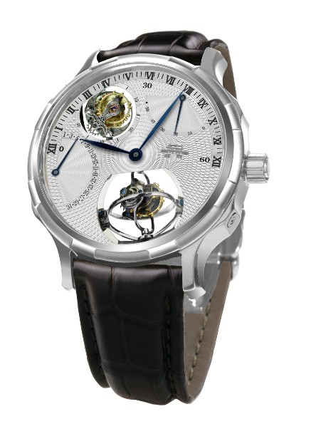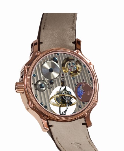 “无极”是中国第一只三轴立体双陀飞轮。它有两套陀飞轮机构:经典的偏心式陀飞轮及双轴立体陀飞轮,位于5点位。立体陀飞轮的立轴被倾斜了25度,视觉效果更为惊艳。配置三种附加功能:能量储备显示、逆跳式日历及背面月相